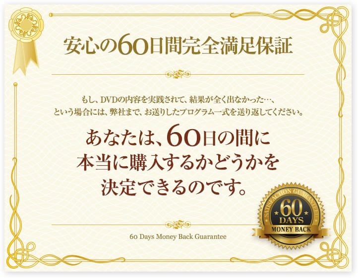 そこで、お求めいただいたDVDの[全額返金満足保証]サービスを設けております。
