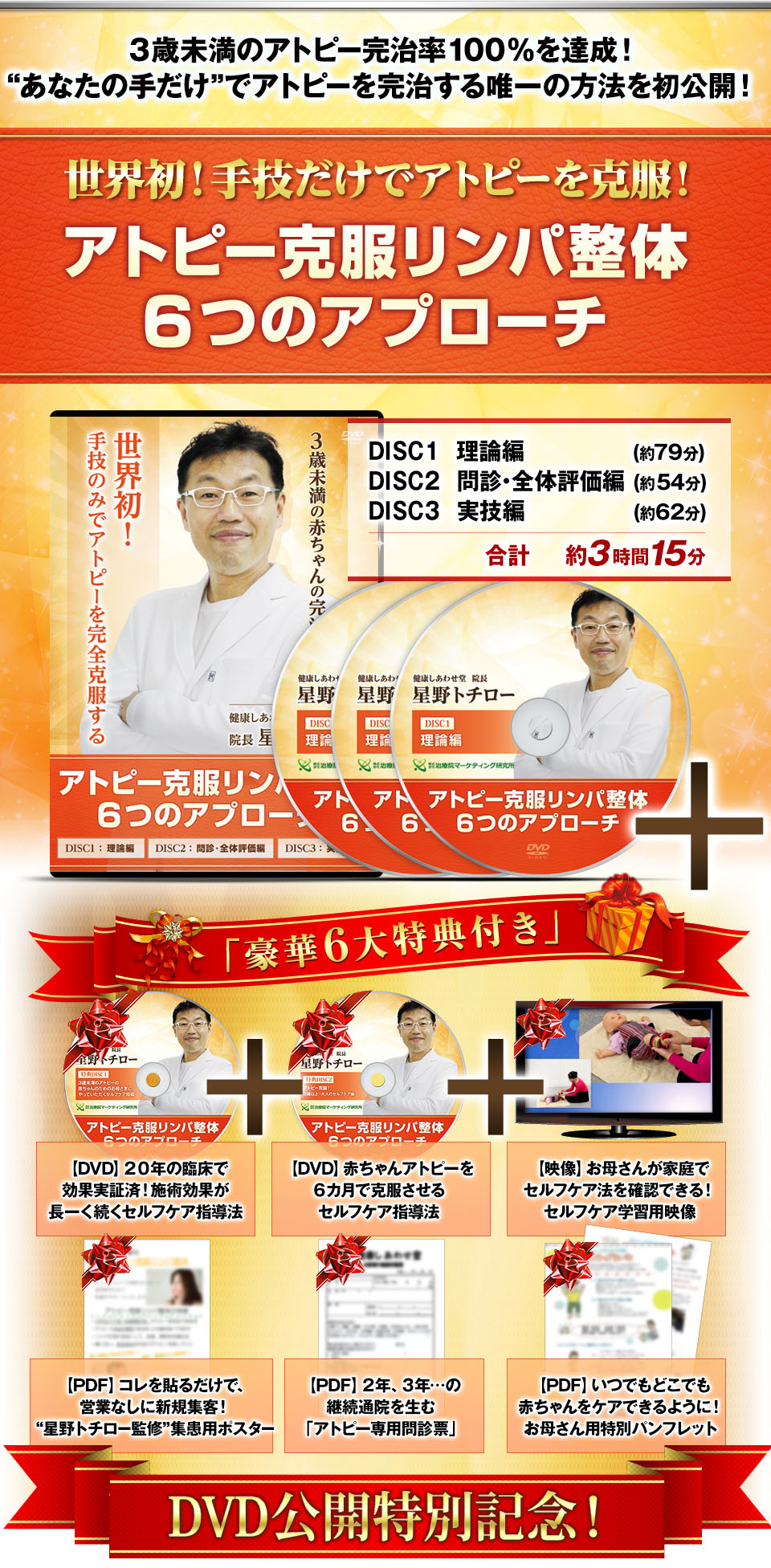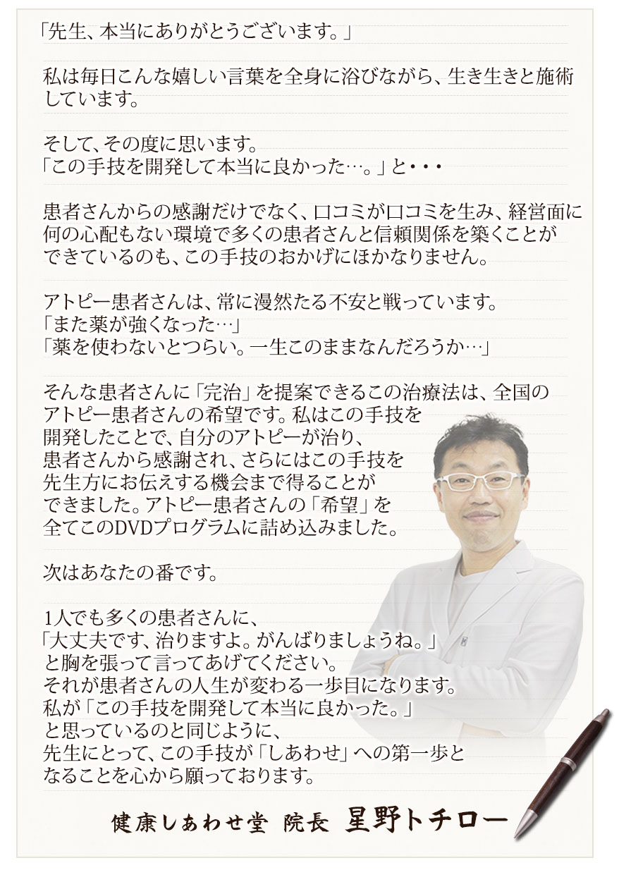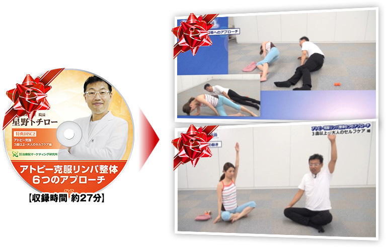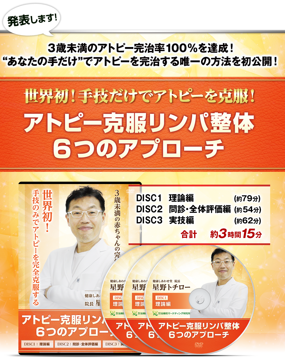 しかし、星野先生が今回DVDで初めてご自身の手技を公開しようと思った目的は、1人でも多くの治療家の先生に、「アトピー克服リンパ整体」をマスターしていただき、日本中のアトピー患者さんに笑顔になってもらうことです。