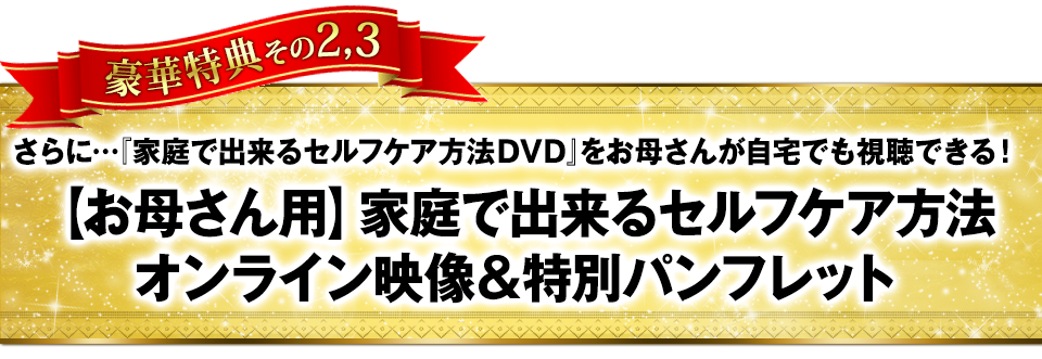 豪華特典①でプレゼントさせて頂く『家庭で出来るセルフケア方法DVD』の映像を、お母さん用にリメイクし、