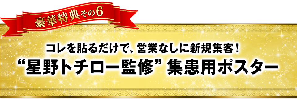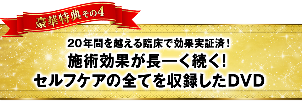 異なるセルフケア方法と収録した特典DISC2枚、患者さんが自宅でセルフケアを学べるオンライン映像&パンフレット、患者さんの継続を生む問診票、新規集患のための院内ポスター…計6点! 盛りだくさんの豪華6大特典の詳細をご覧ください!